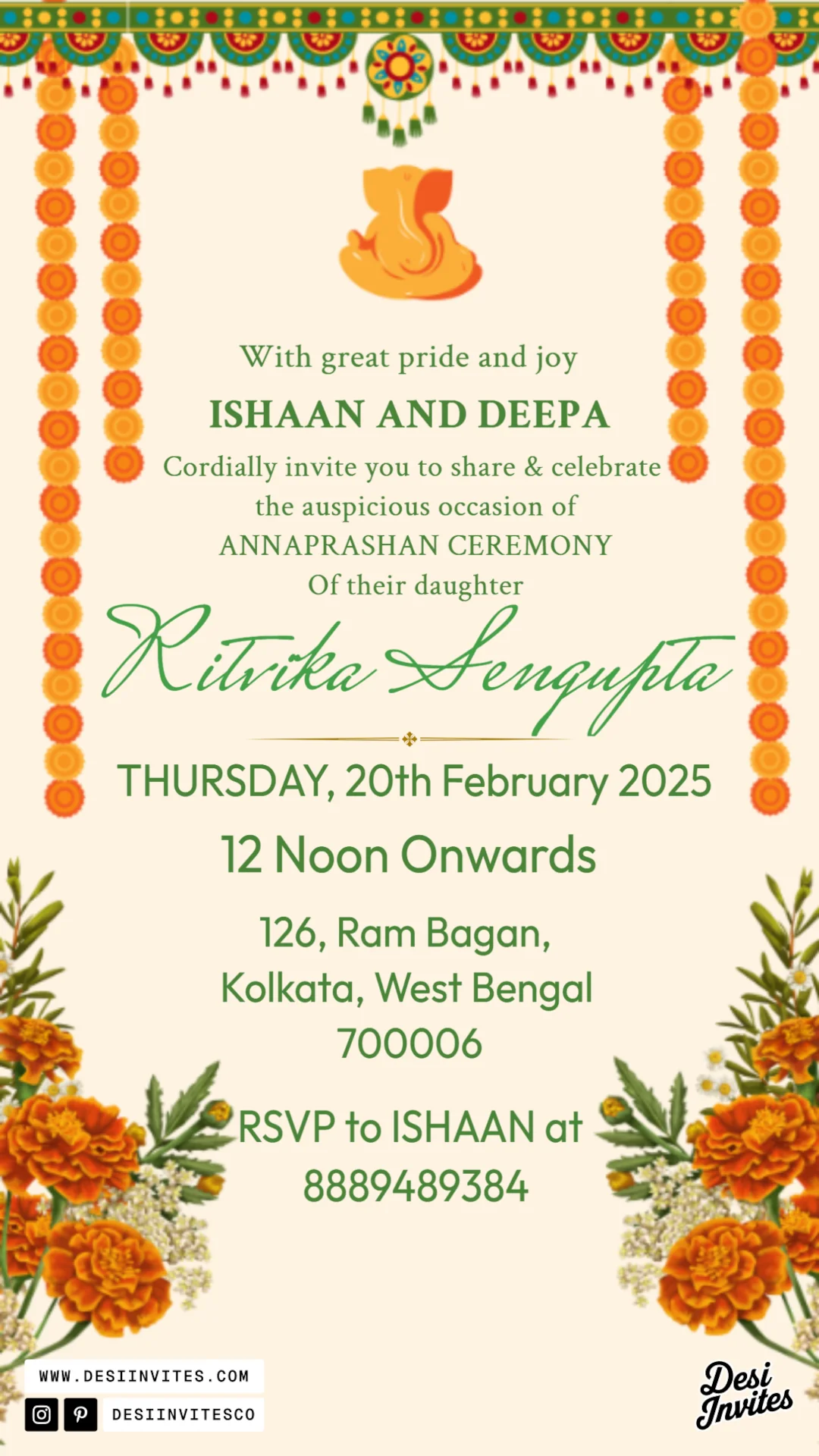 Celebrate your baby’s Annaprashan with a digital invite featuring marigold motifs and customizable details. Share Bengali traditions effortlessly via email or social media.